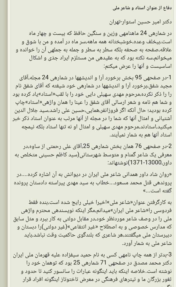 شما در ماهنامهی وزین حافظ در نامهای با نام (دفاع از نام استاد و شاعر ملی) مرقوم فرمودید: